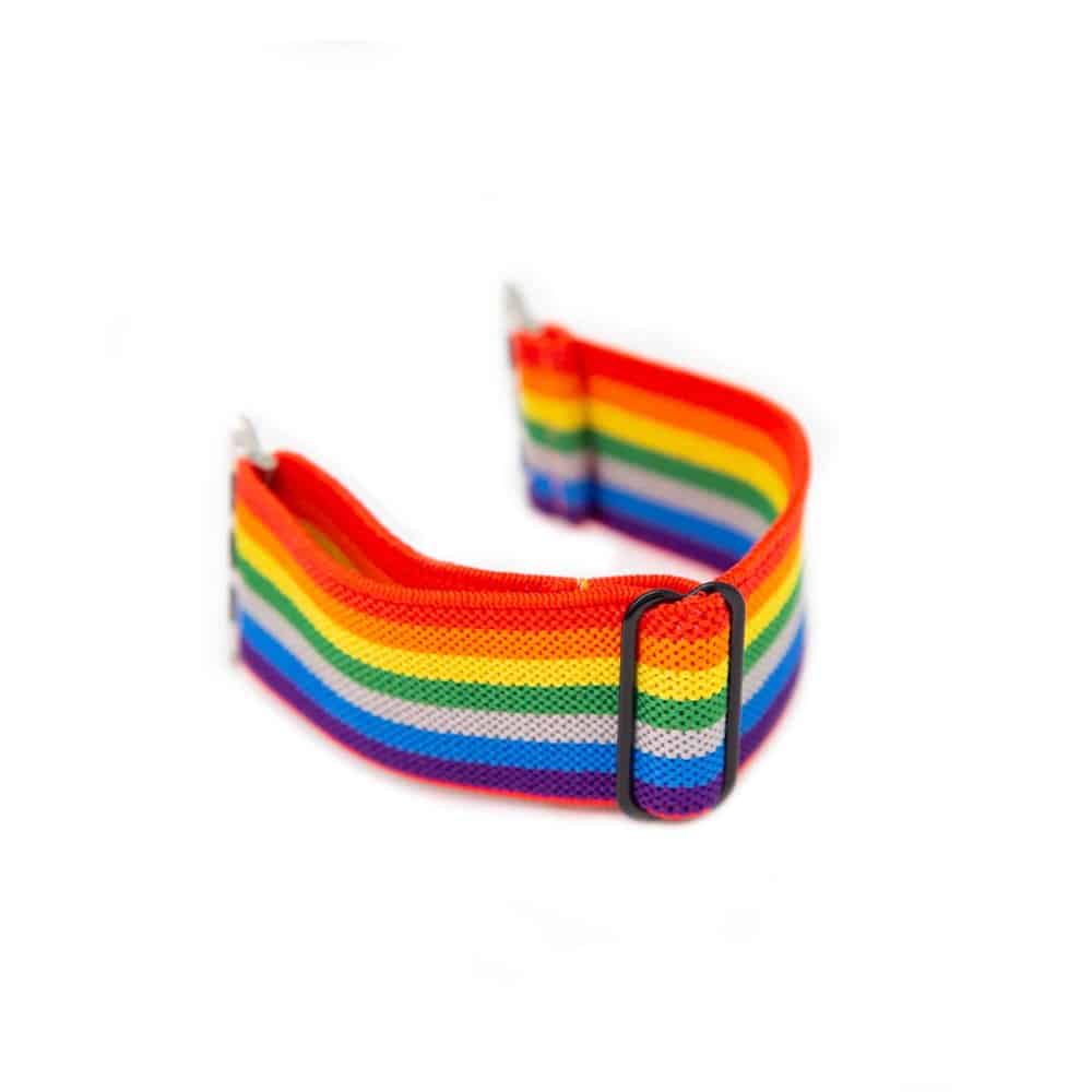 colourful rainbow-print nylon strap.